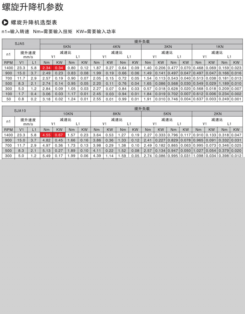 螺旋升降機正常工作狀態下的輸入功率不能超過最大輸入功率,輸入功率kw=(滿載扭矩Nm x負載率x輸入轉速rpm )/ 9550m,